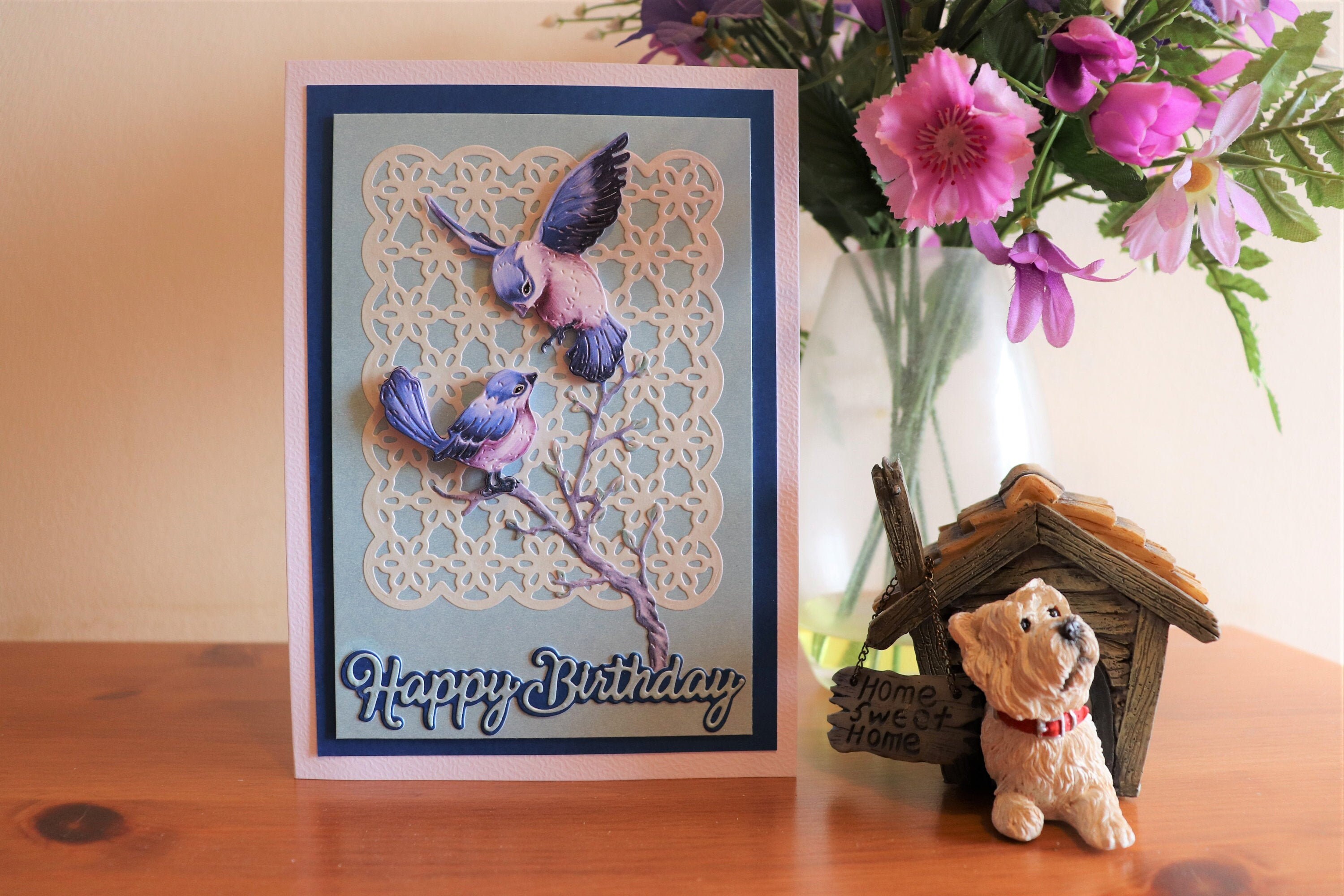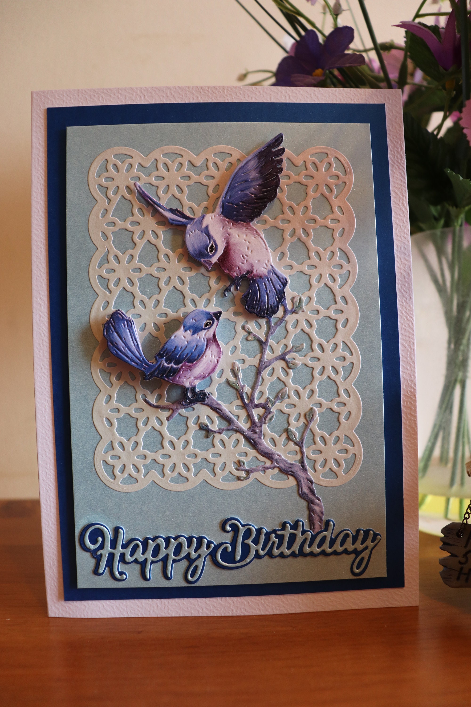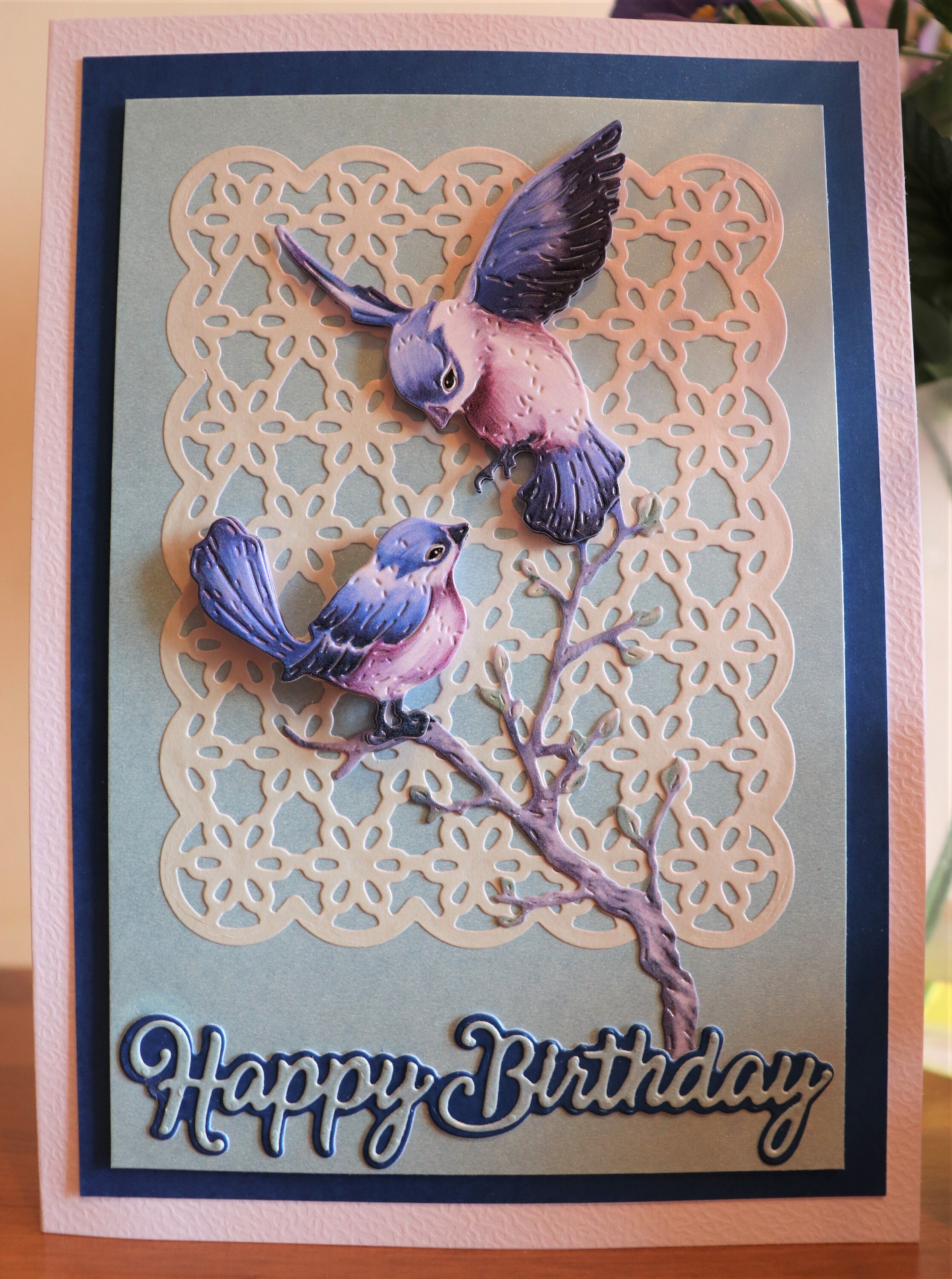 Handmade Decoupage 3D Birthday Card with 3D blue birds on a die cut lace background, frames of light and dark blue and sentiment in matching blues.