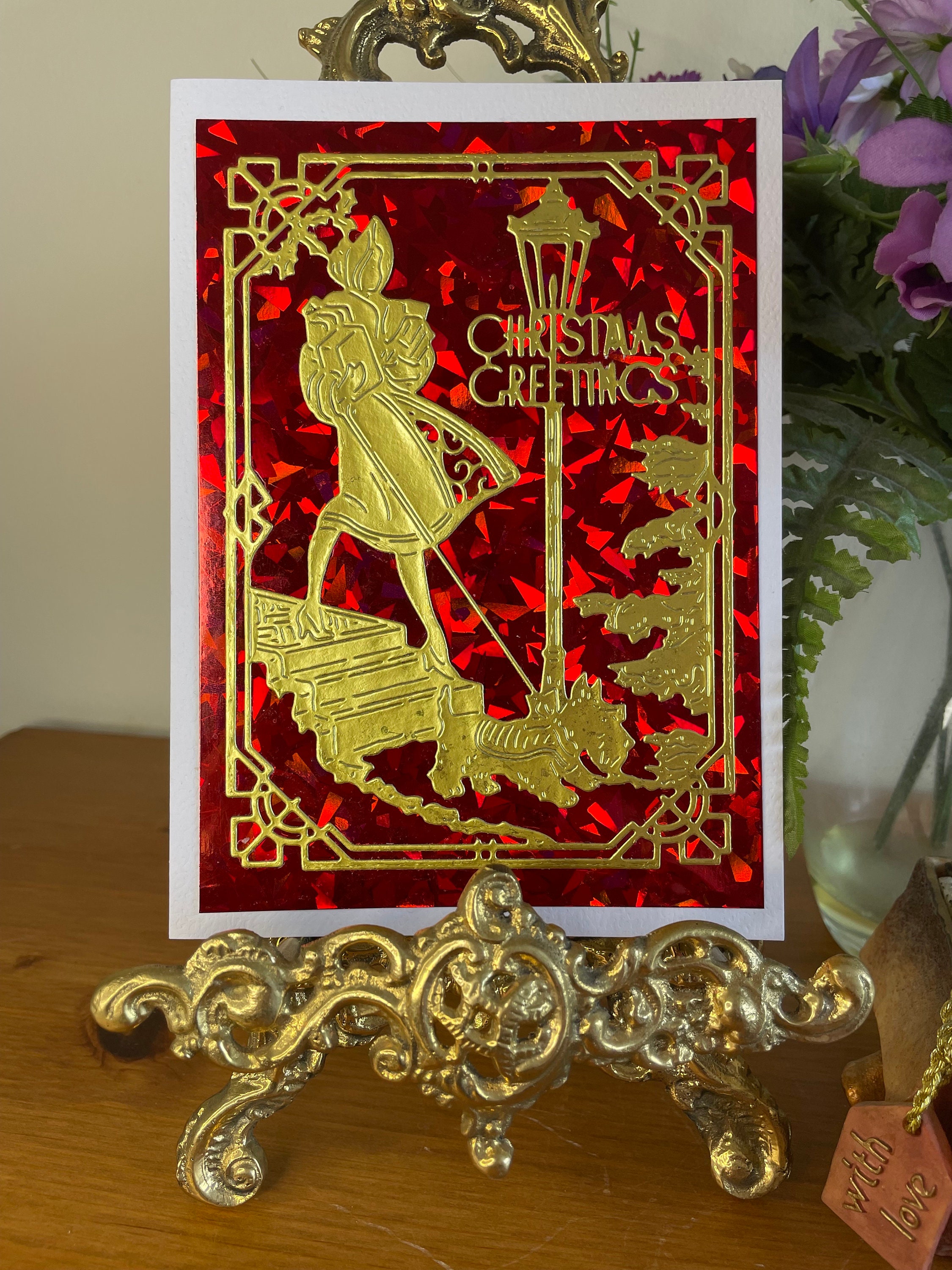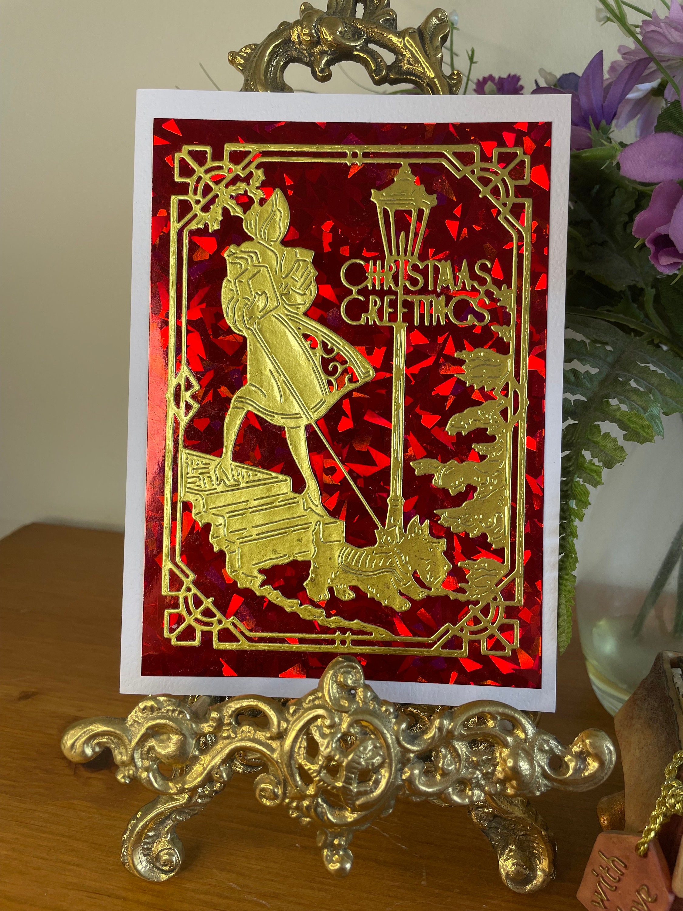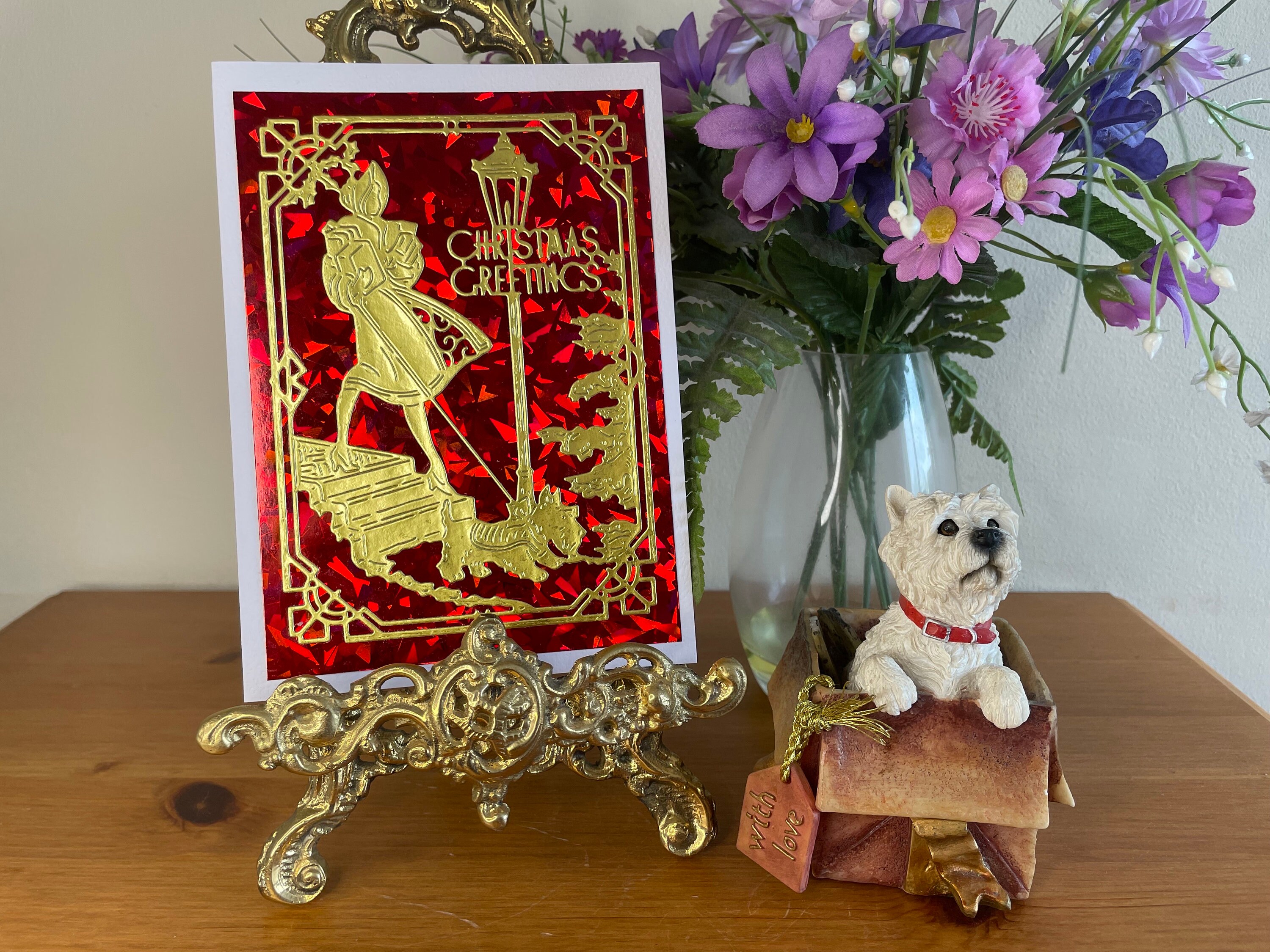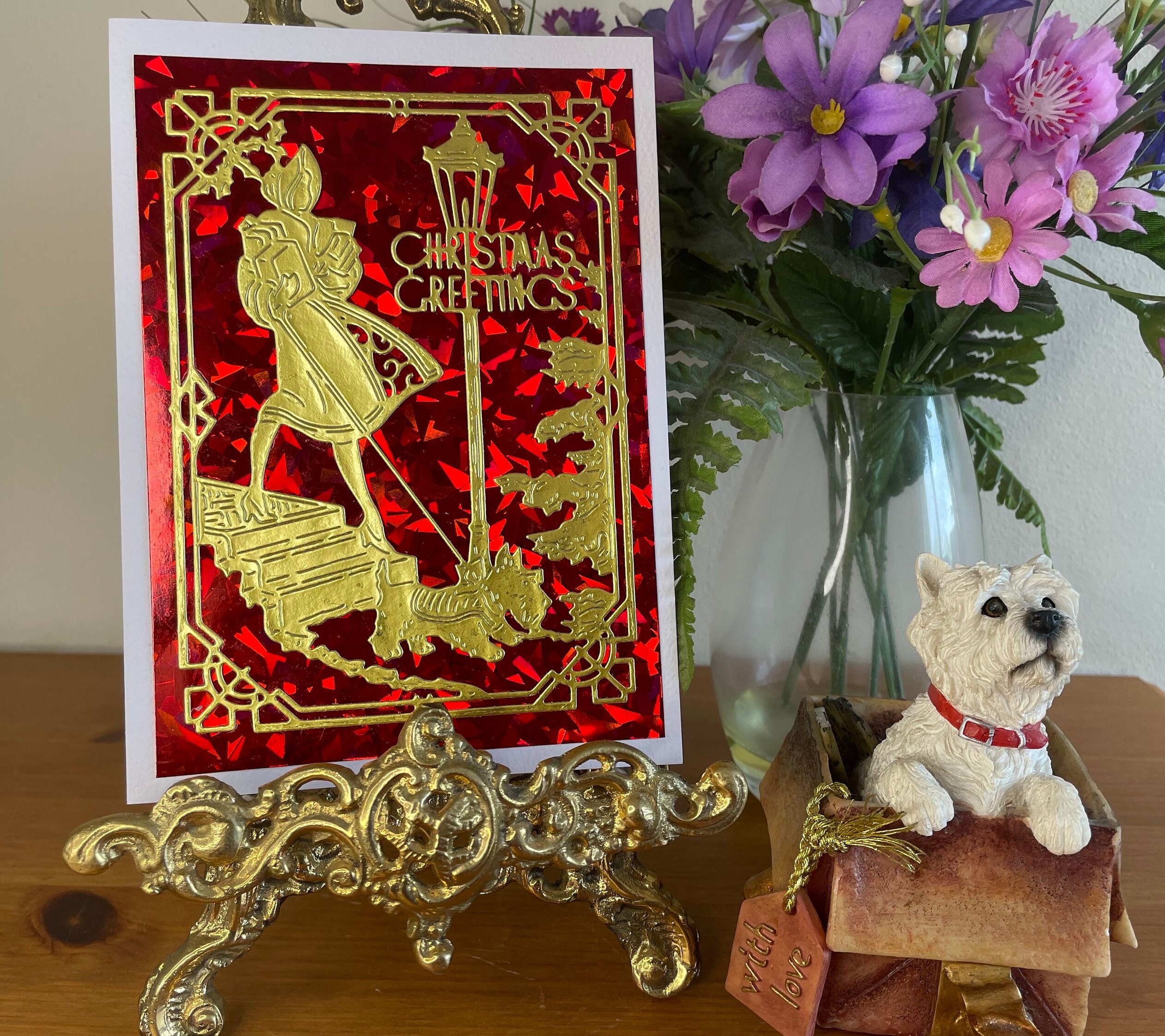 Unique Handmade Christmas Card with red holographic metallic card background and gold die cut scene of a lady Christmas shopping with her Scotty dog.