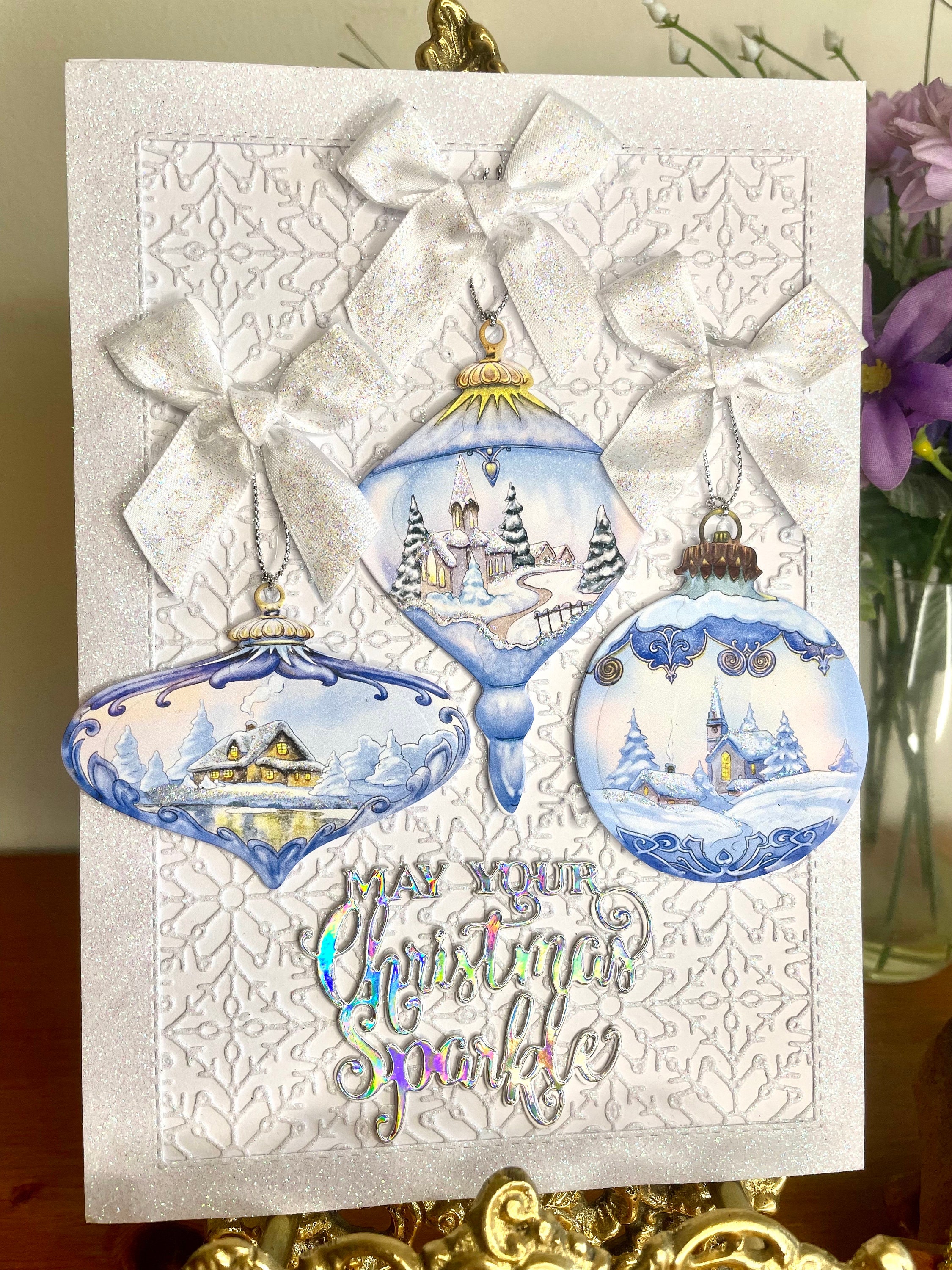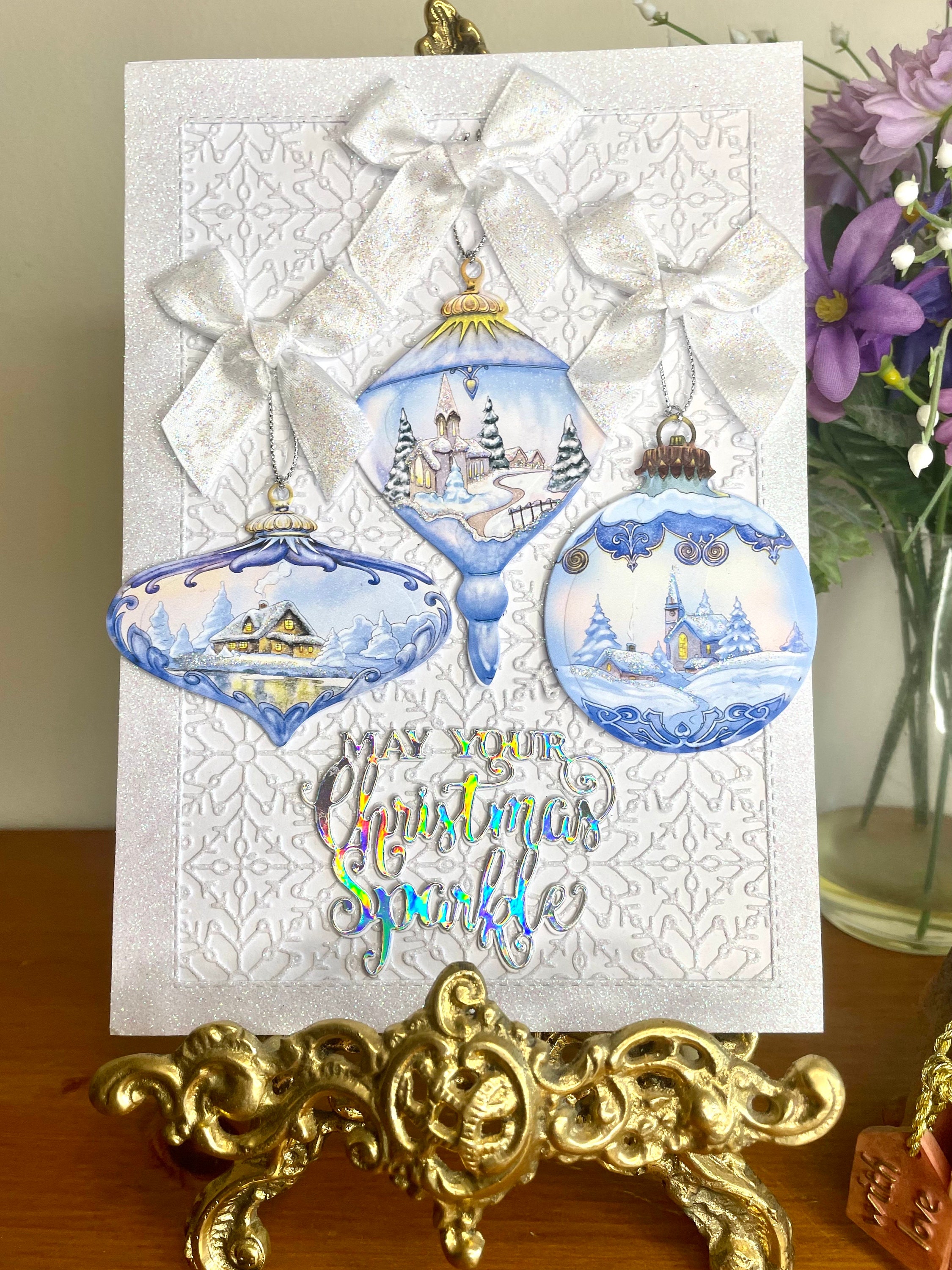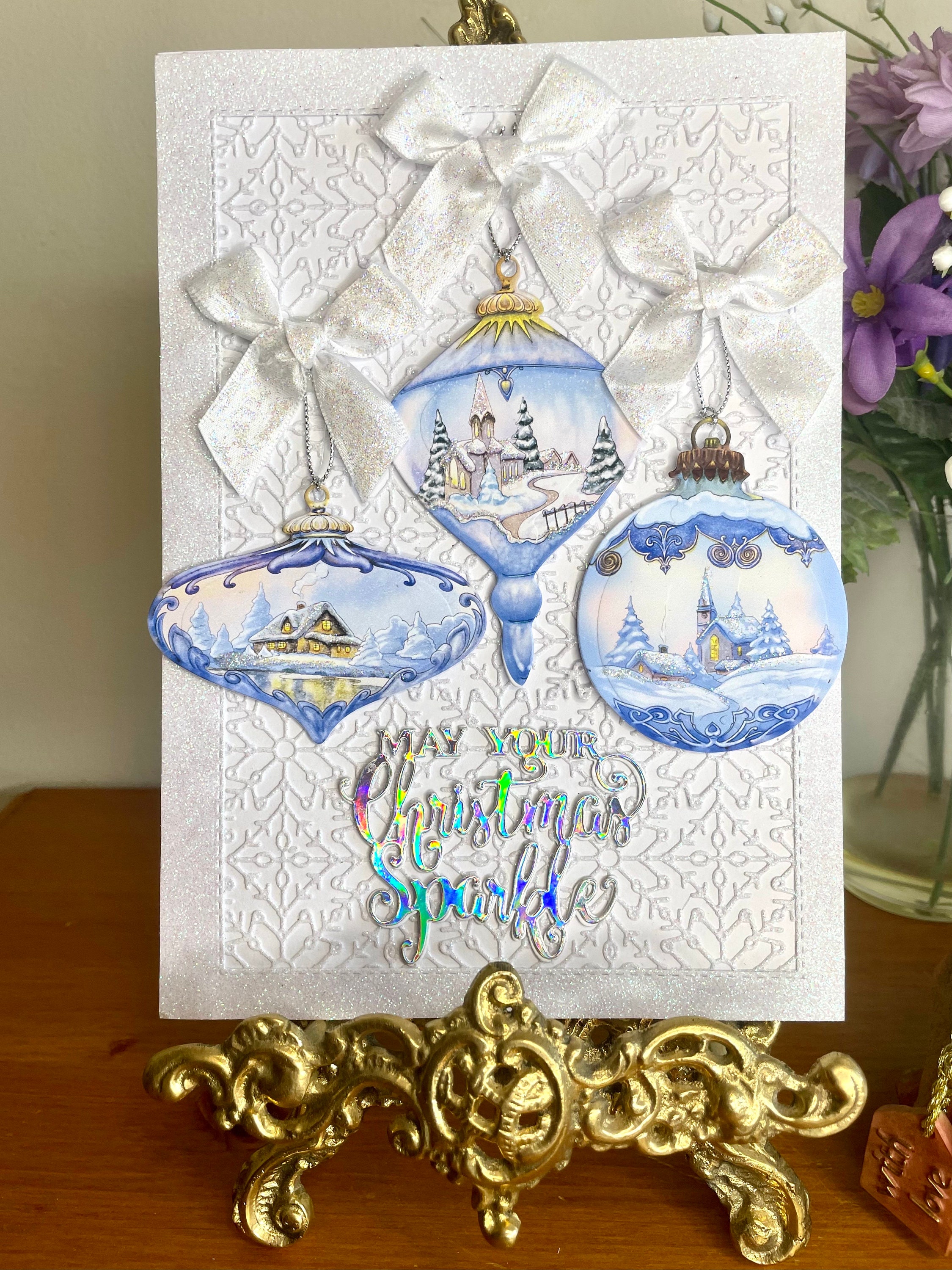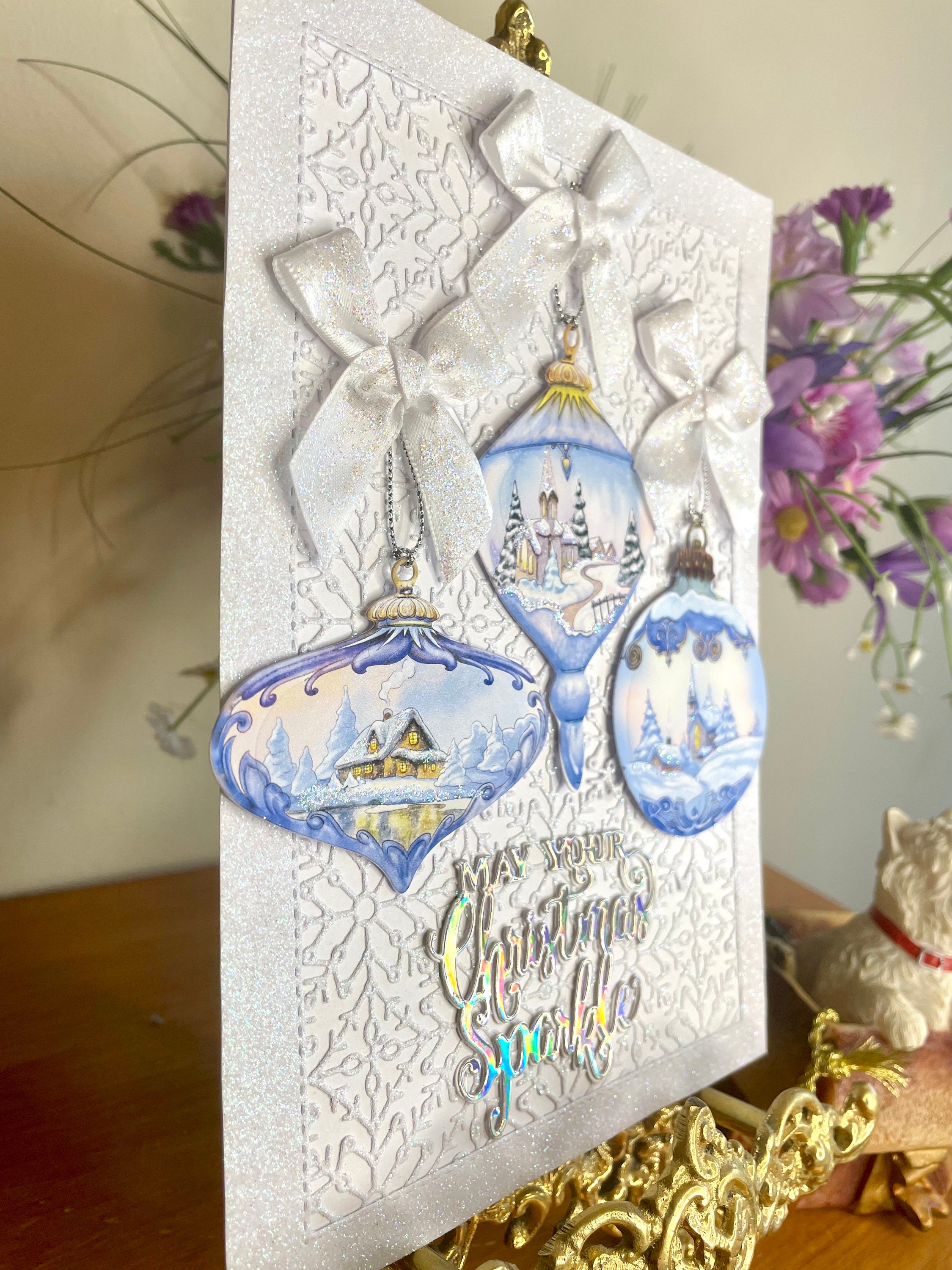 Large Handmade A5 Unique Christmas Card, 3D Decoupage Christmas Baubles and Glittery Bows on a die cut glitter panel and frame with multi coloured holographic die cut sentiment.