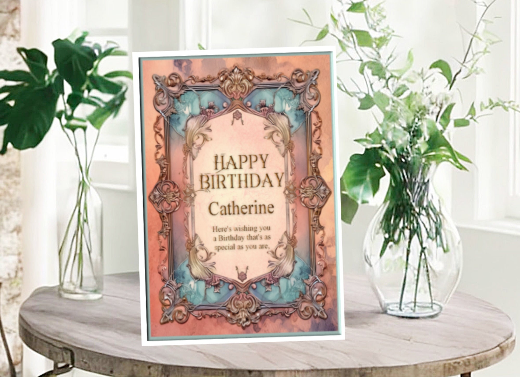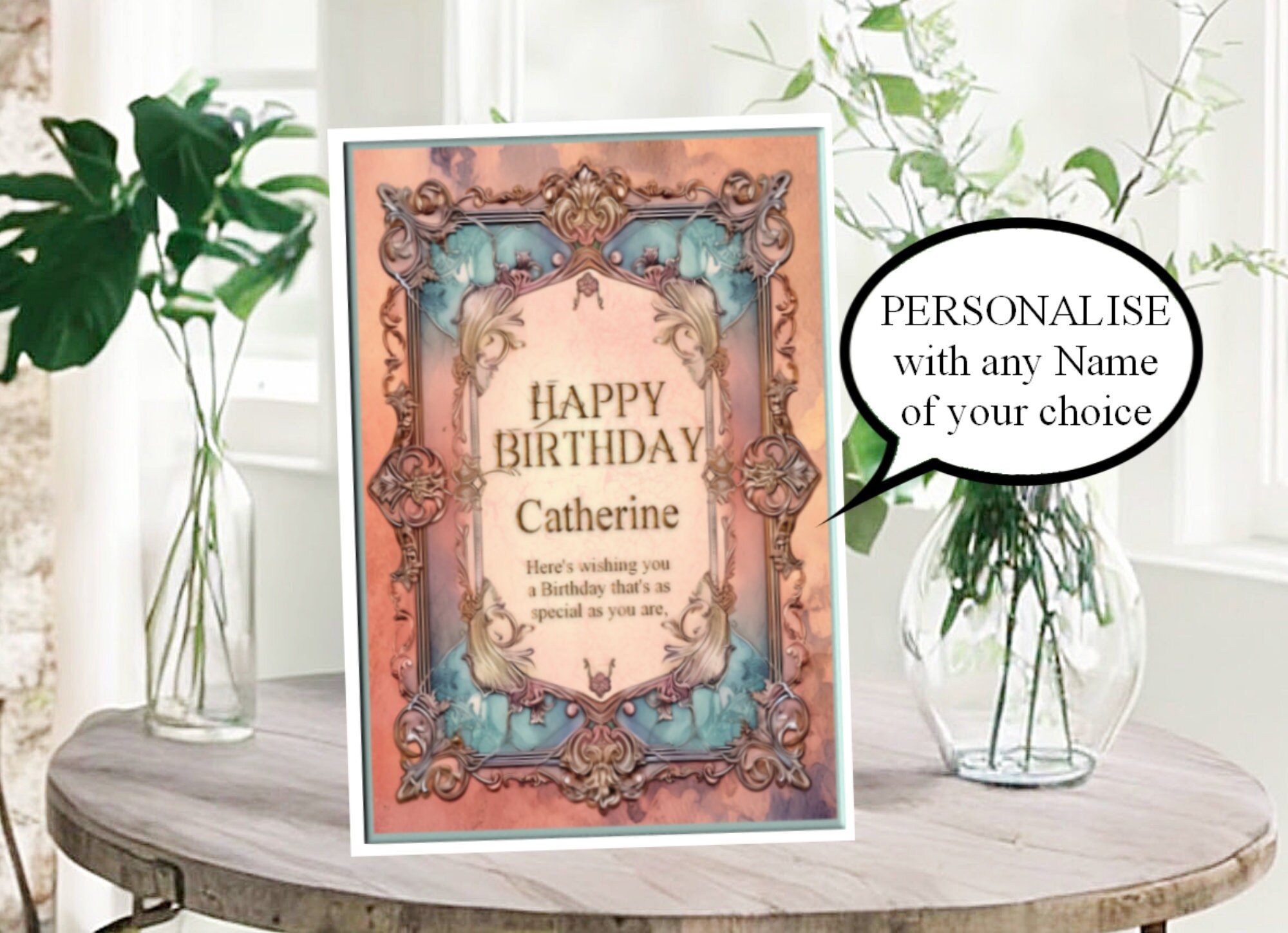 Personalised Birthday Card, any Name in a Vintage Frame Card in sea blue and peach shades in a baroque design.