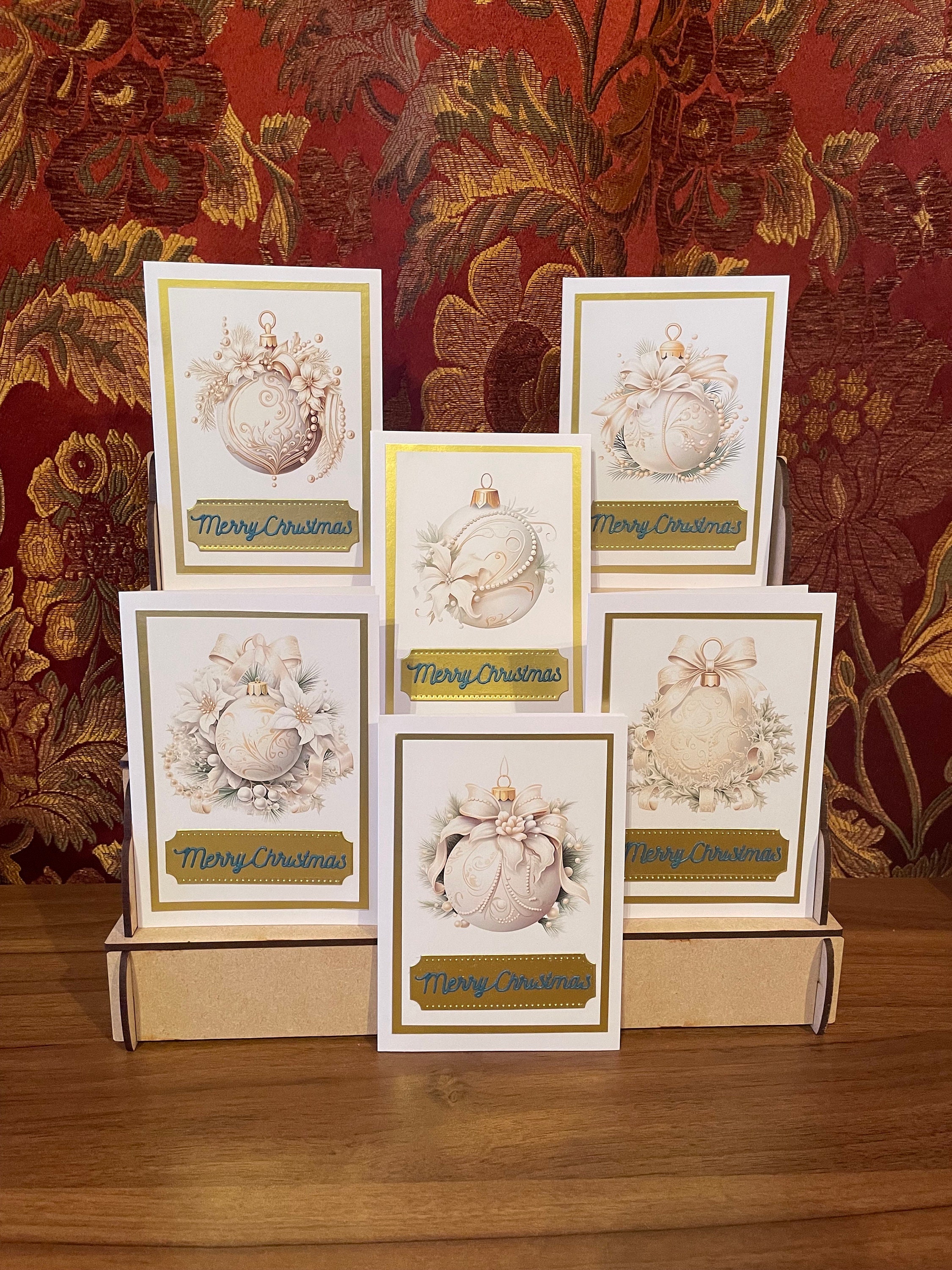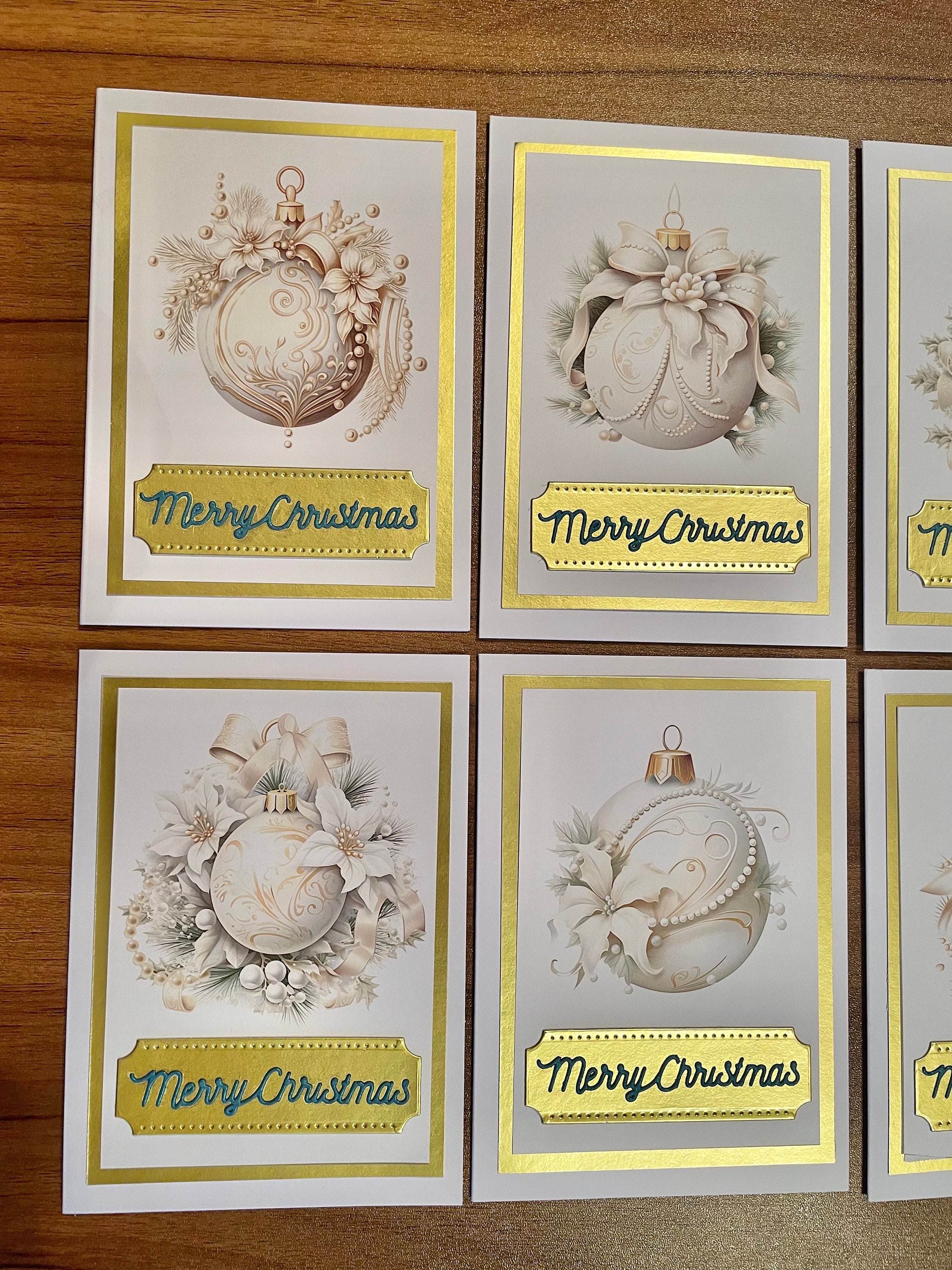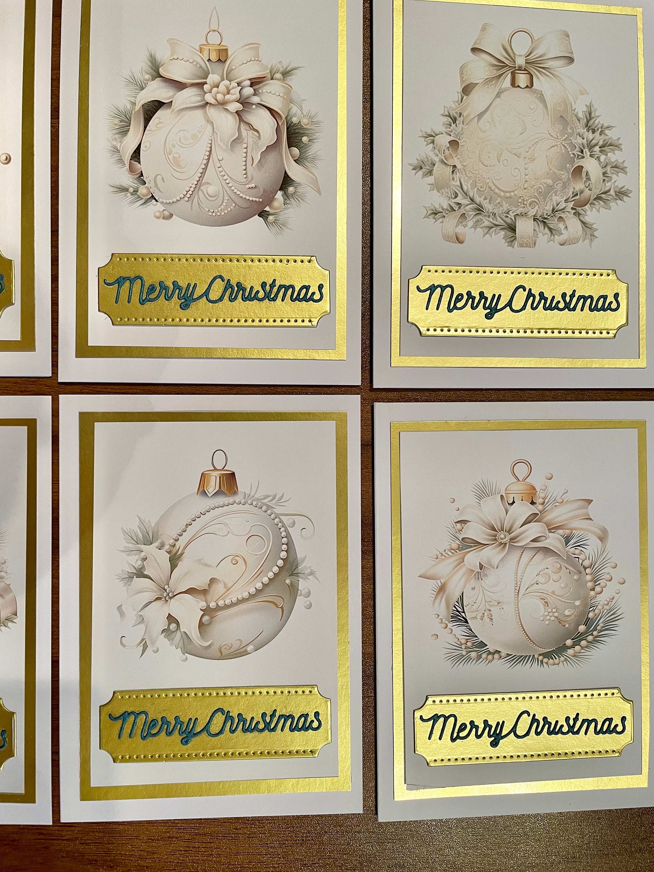 Pack of 6 Different Handmade Christmas Cards with White and Gold Baubles mounted on gold card, with die cut label and sentiment.