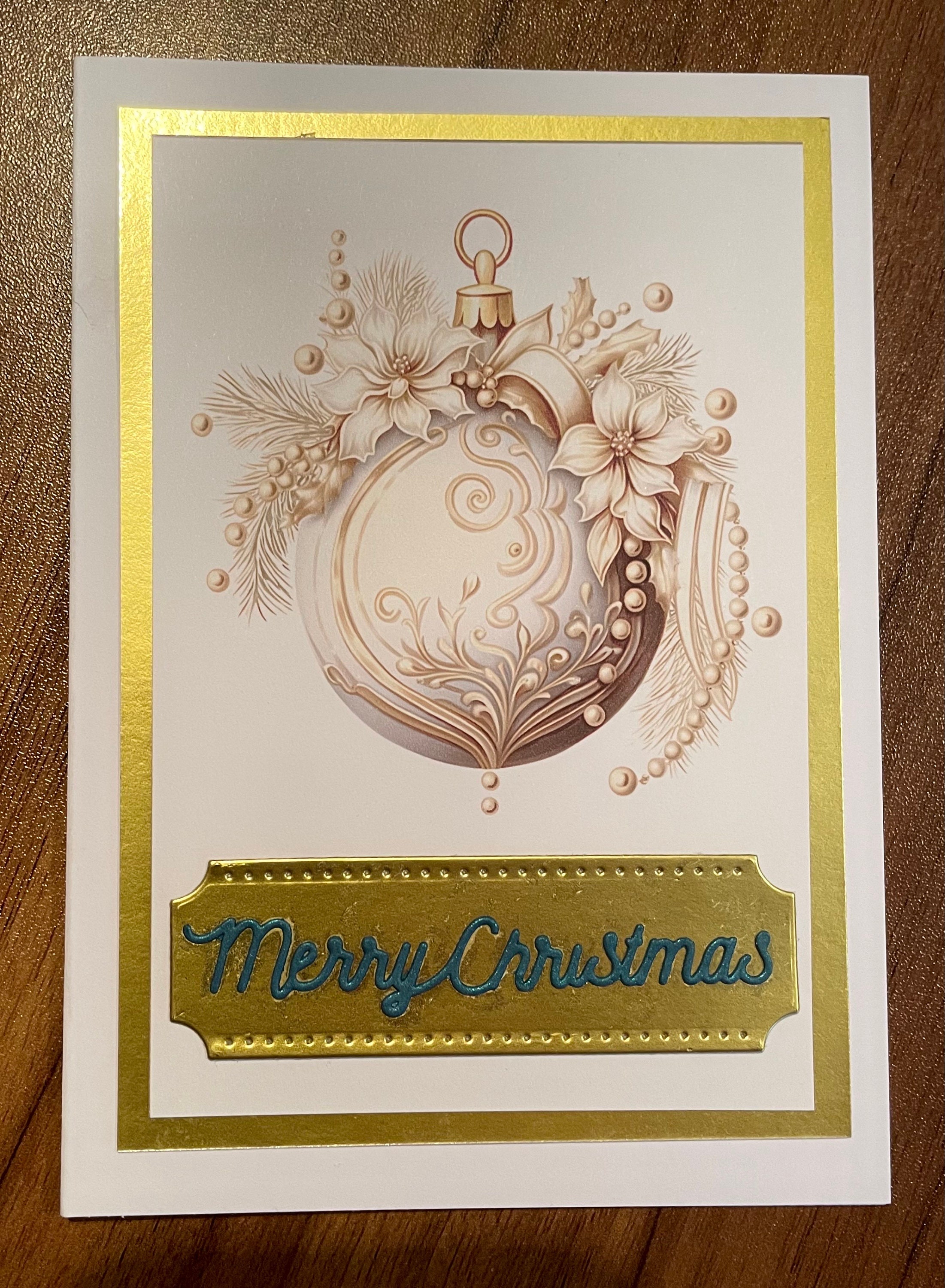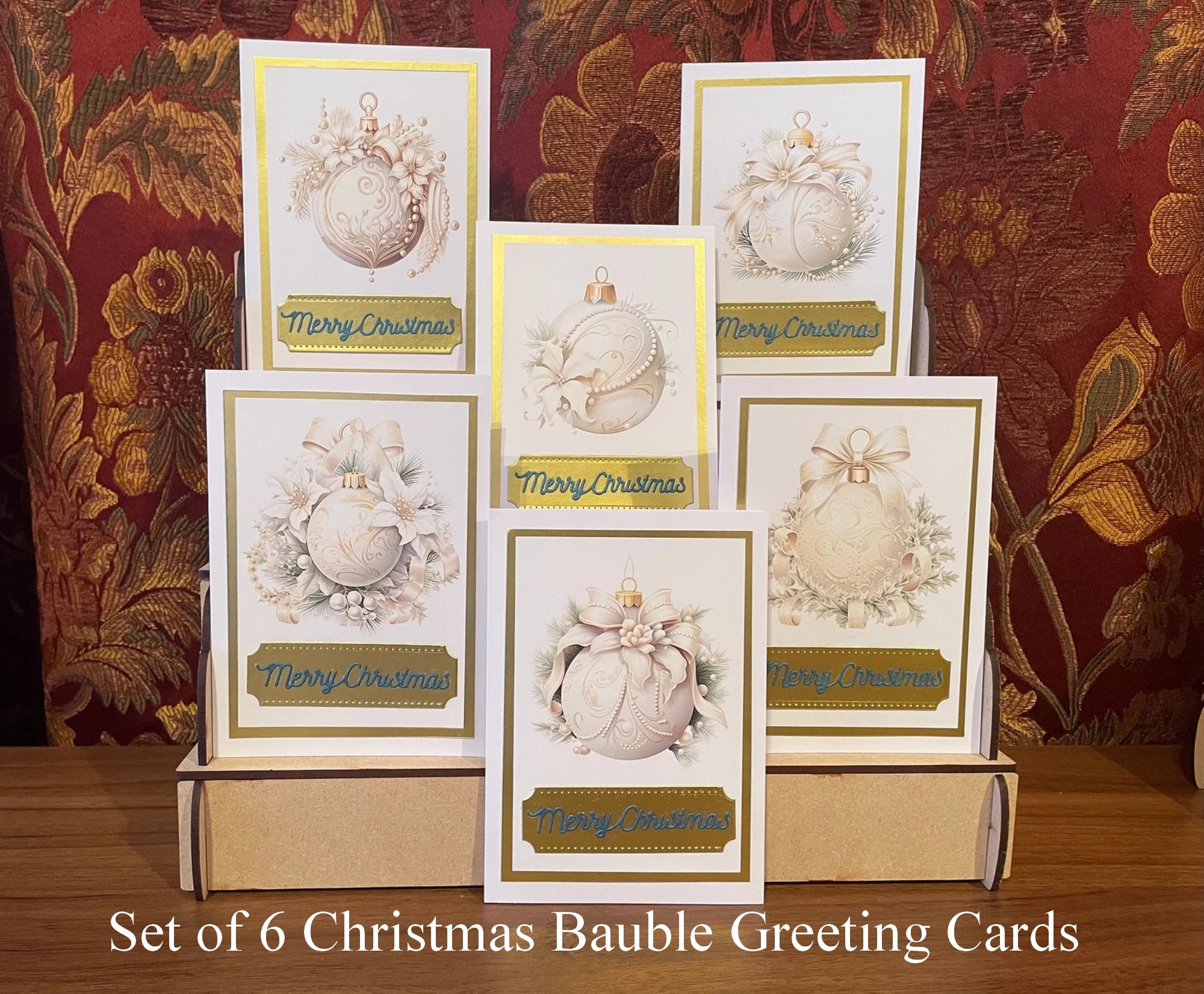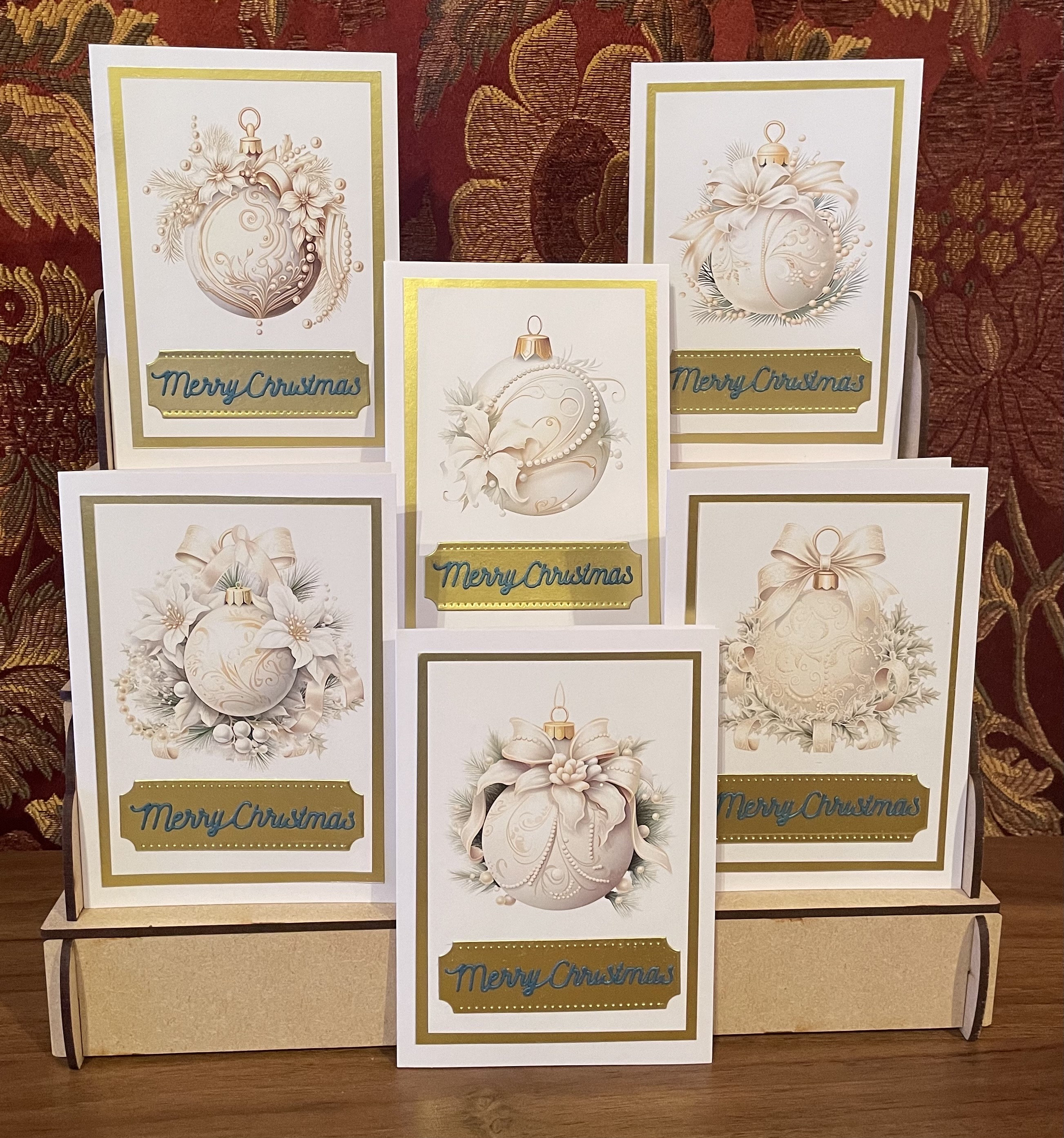 Pack of 6 Different Handmade Christmas Cards with White and Gold Baubles mounted on gold card, with die cut label and sentiment.