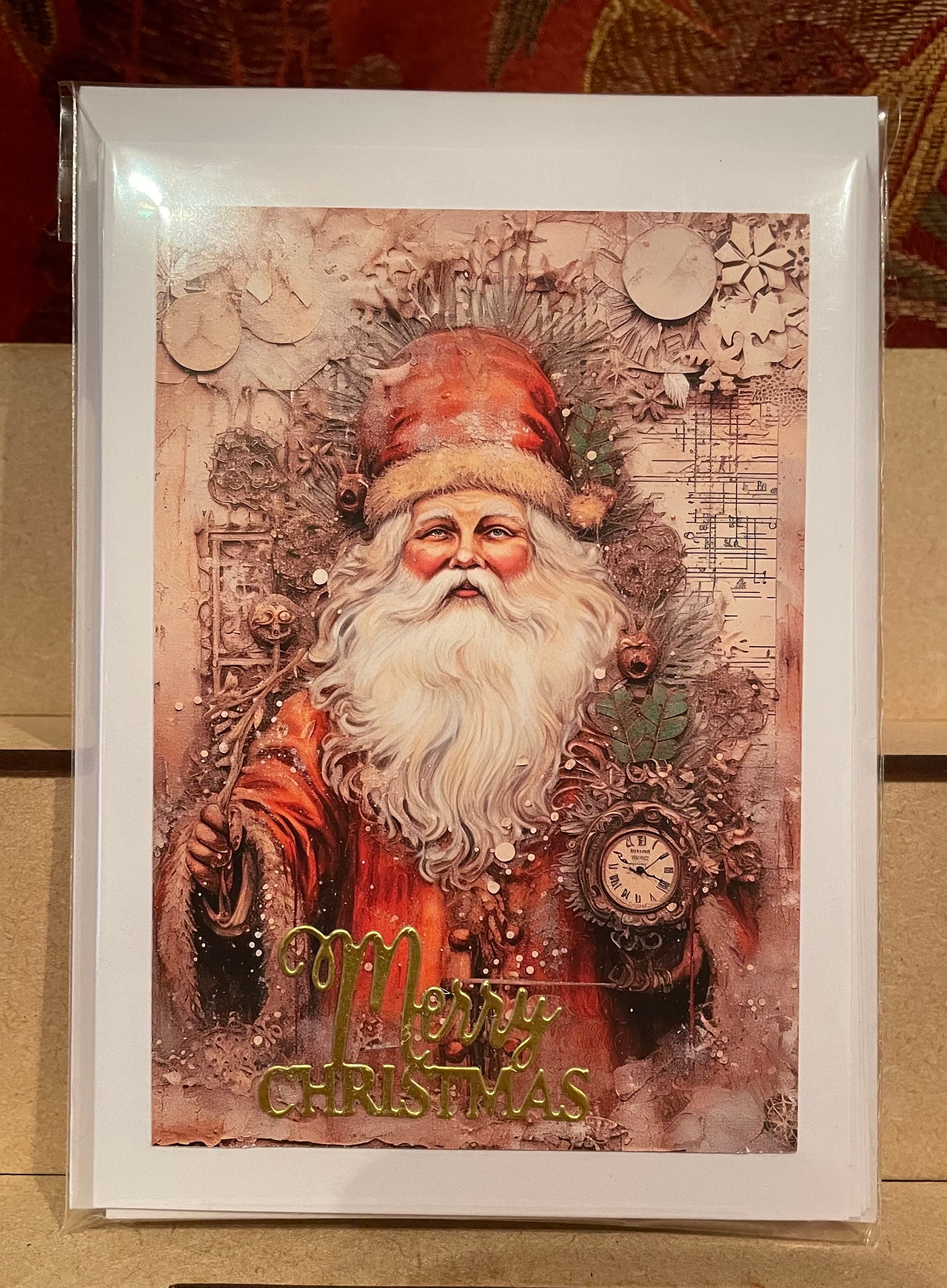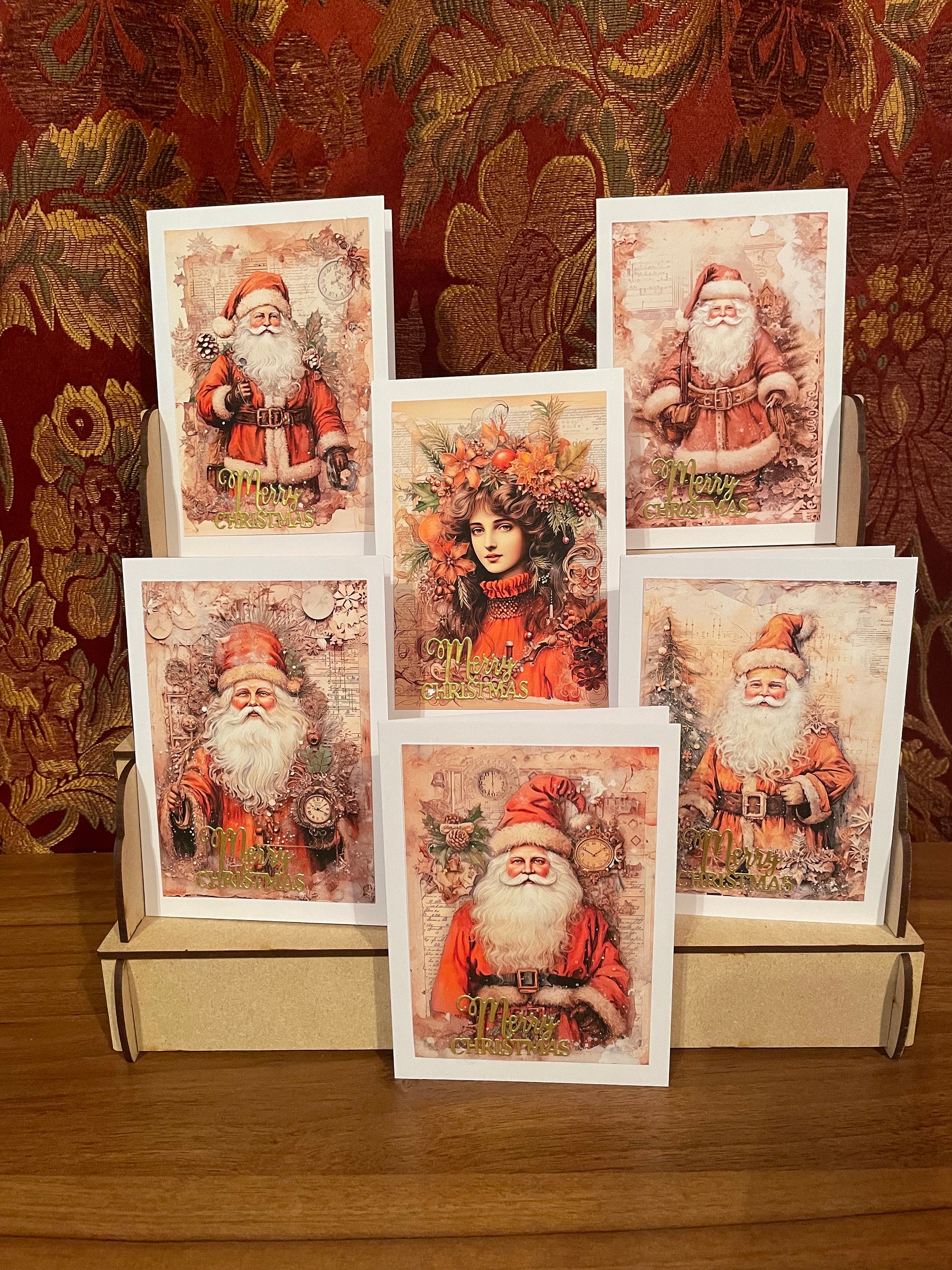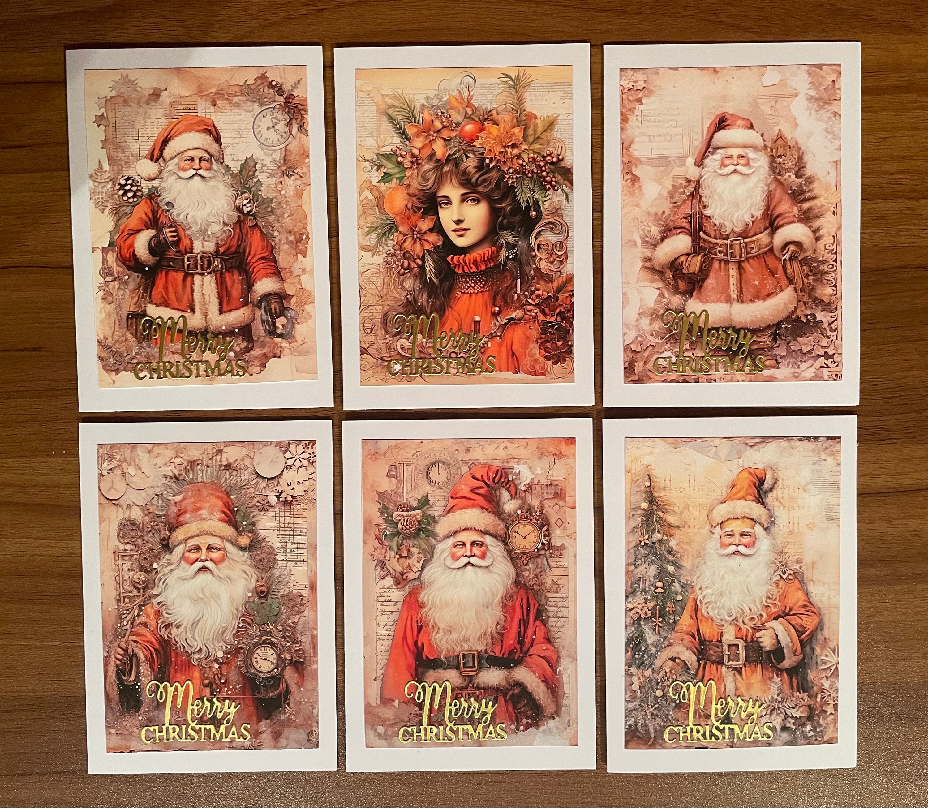 Pack of 6 Different Square Handmade Christmas Cards with Santa Claus, Father Christmas.