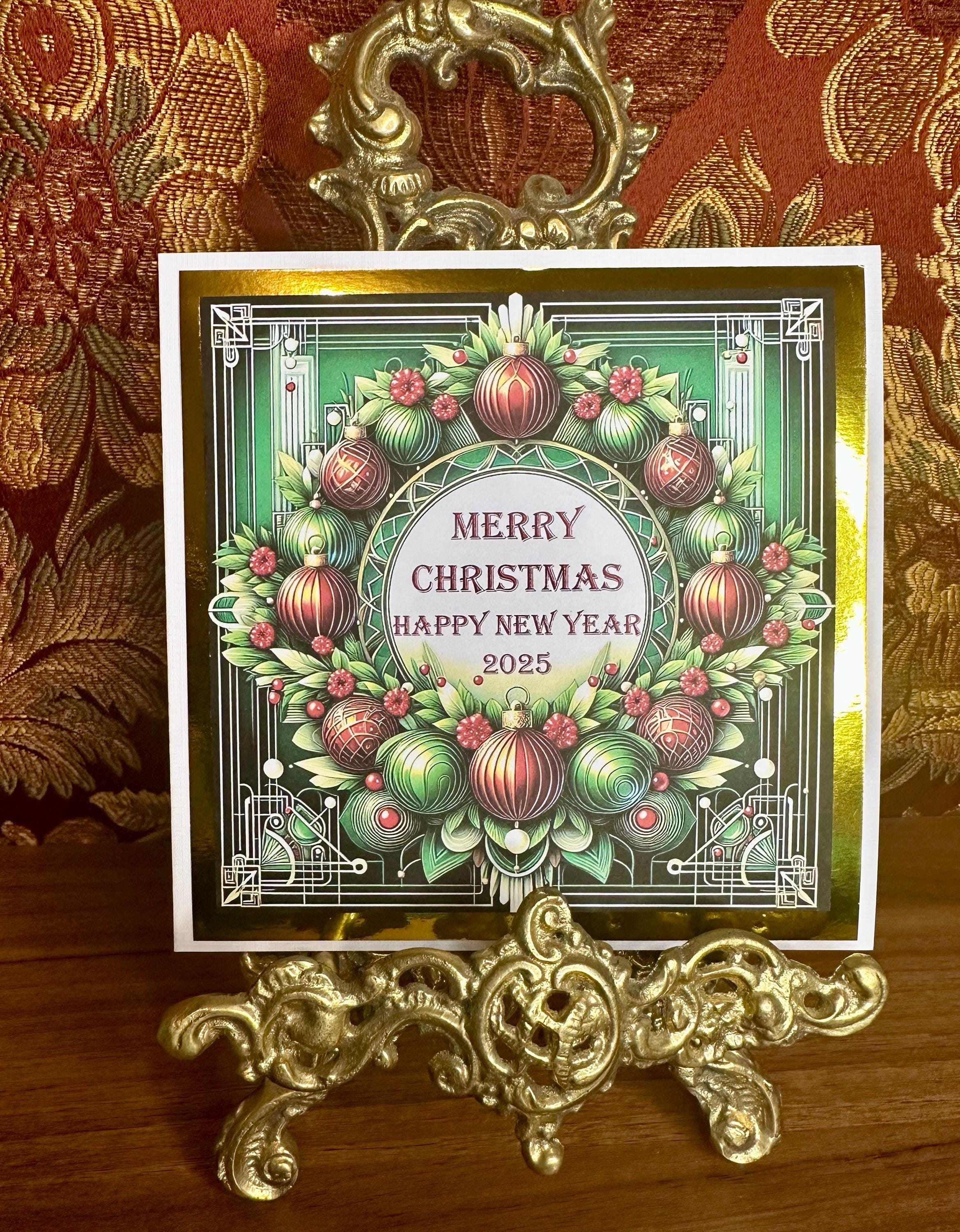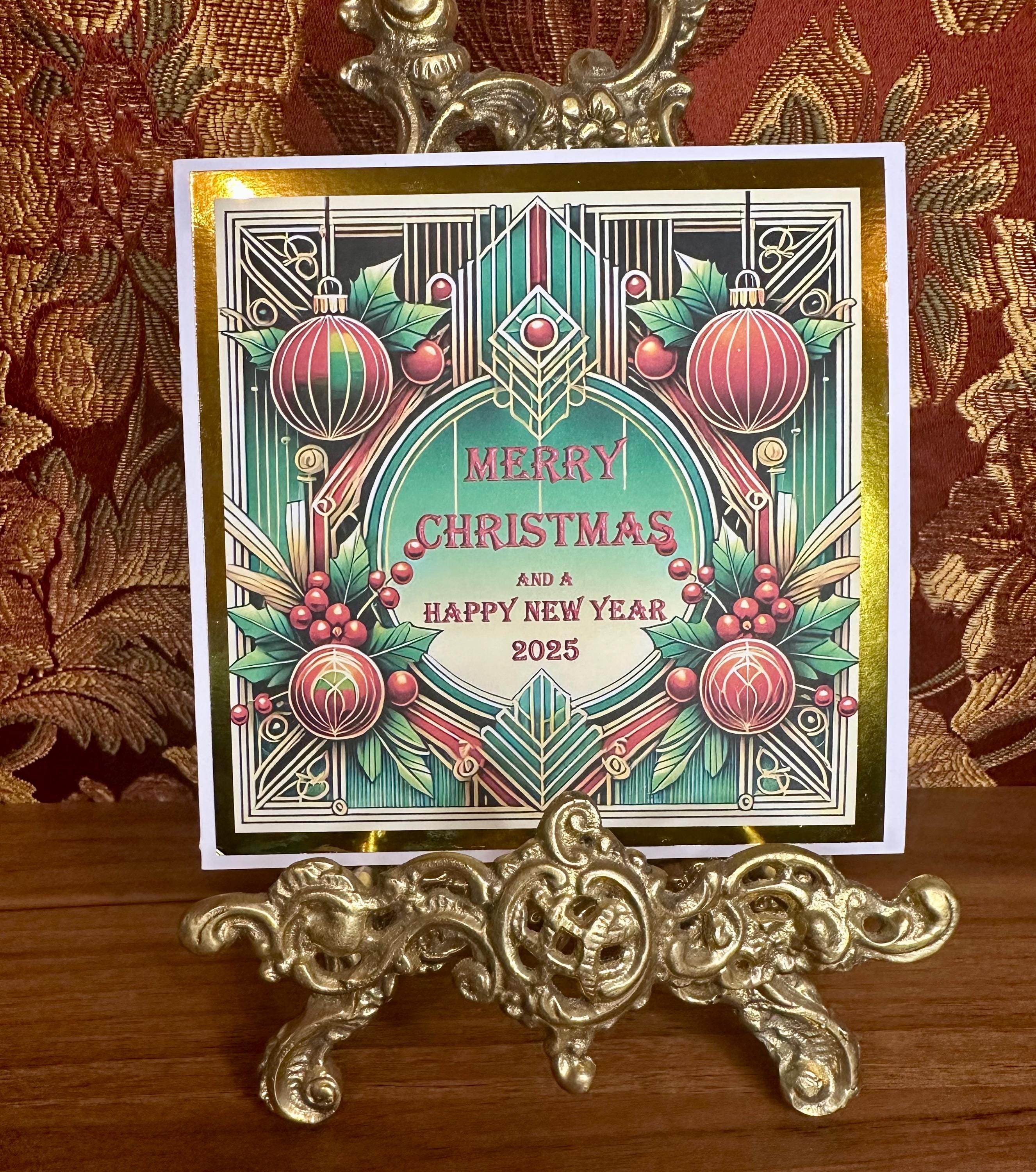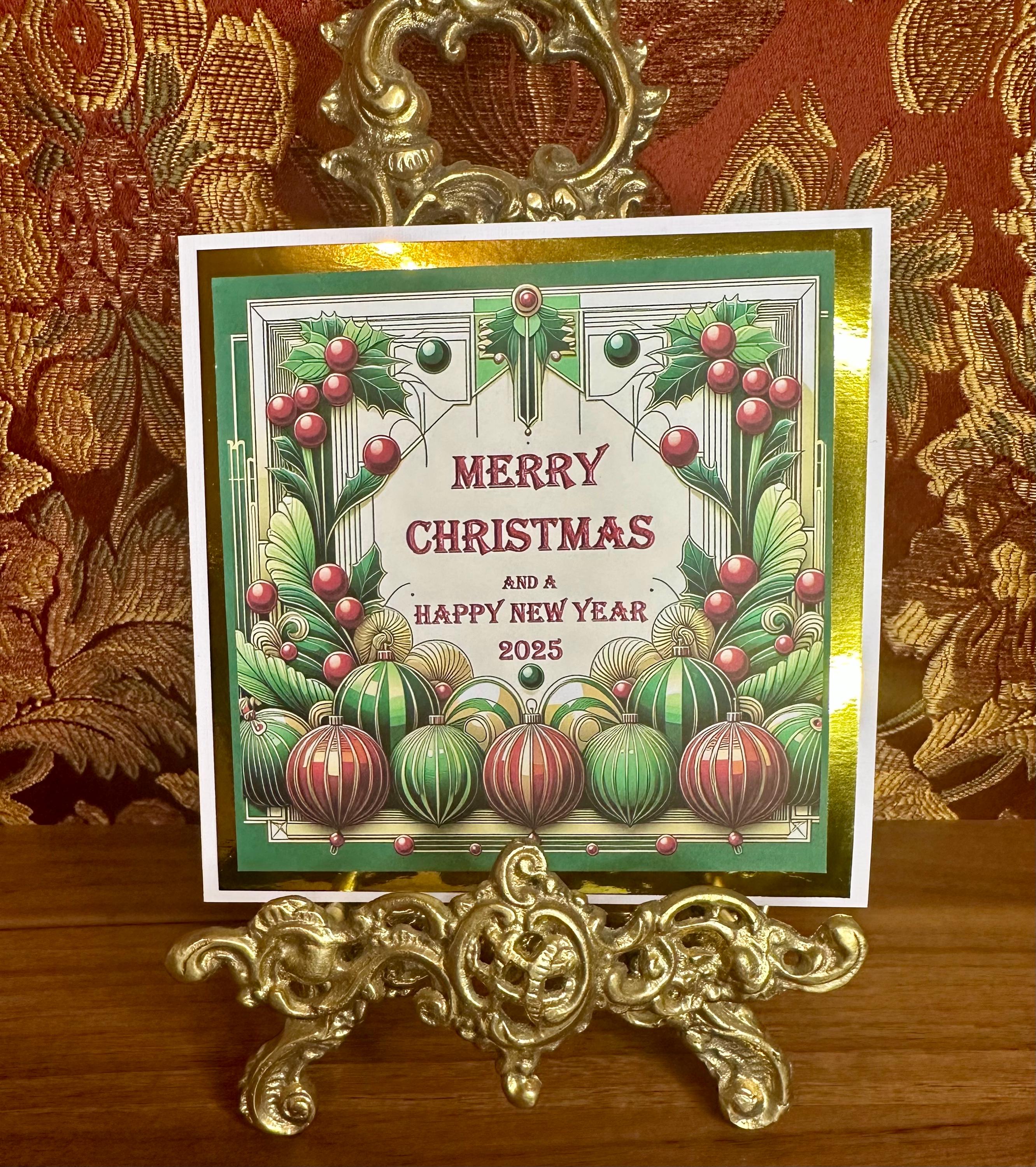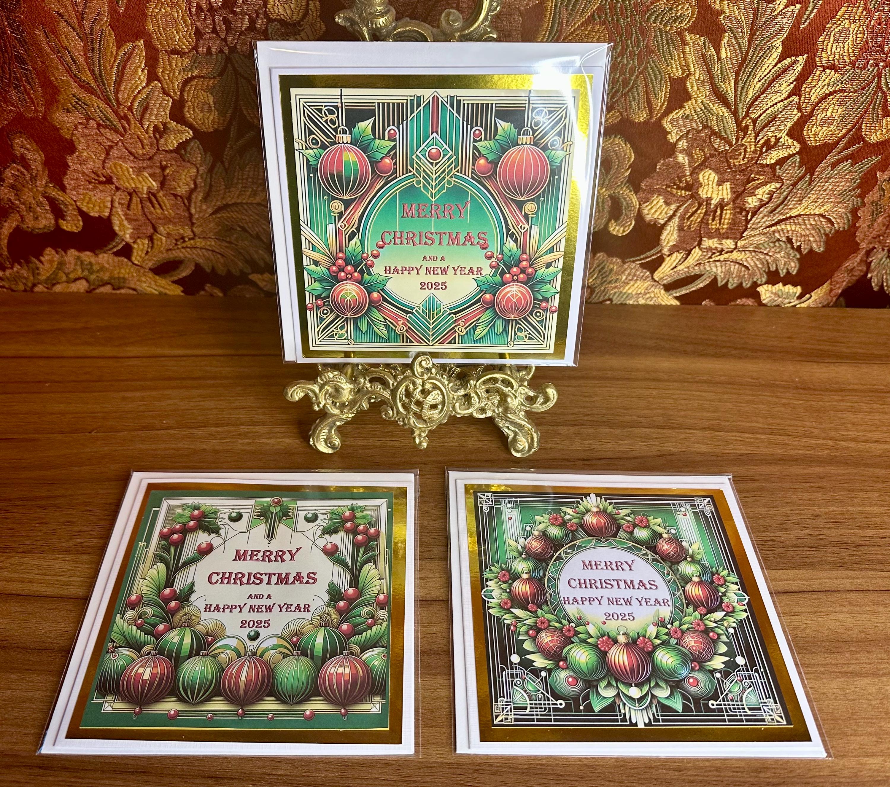 Set of 3 Unique Handmade Christmas Cards, design of christmas baubles with an art deco theme, mounted on gold card.