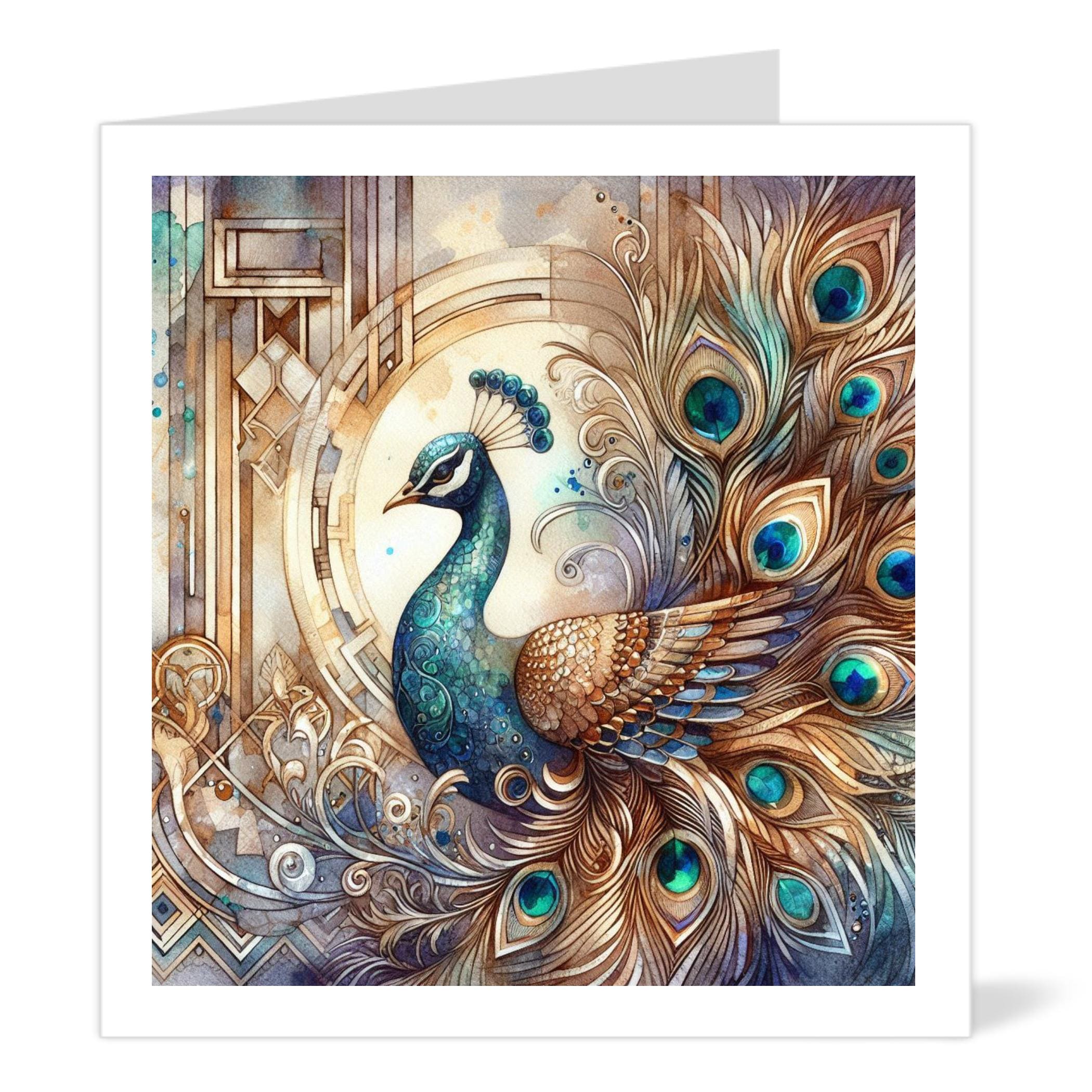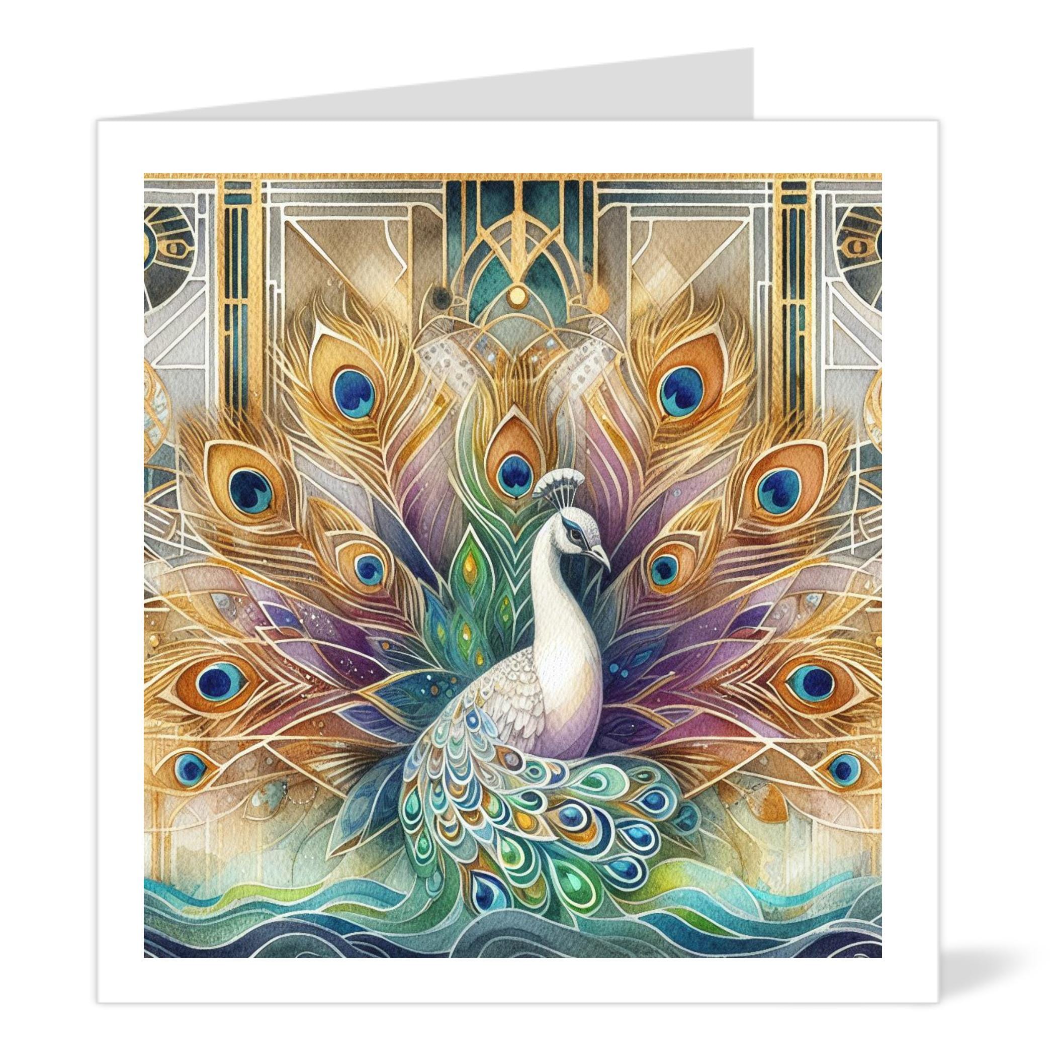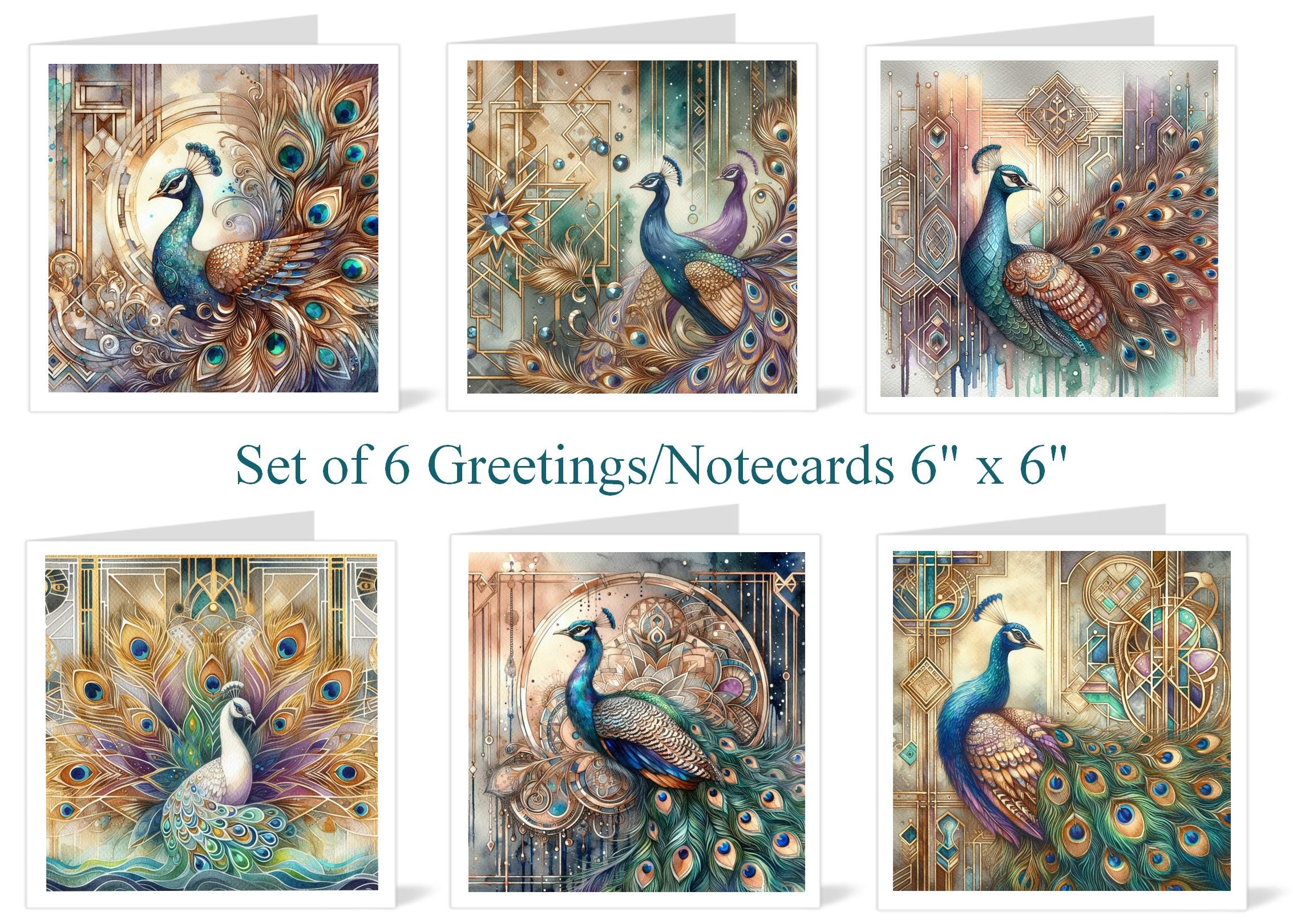 Set of 6 Luxury Art Deco Peacock Greeting or Note Cards, Blank 6" x 6" with Envelopes, Postage Free, supplied with cards & envelopes tied with ribbon in a white gift box. Printed on 220gsm matte photo quality card and mounted on 300gsm cards.