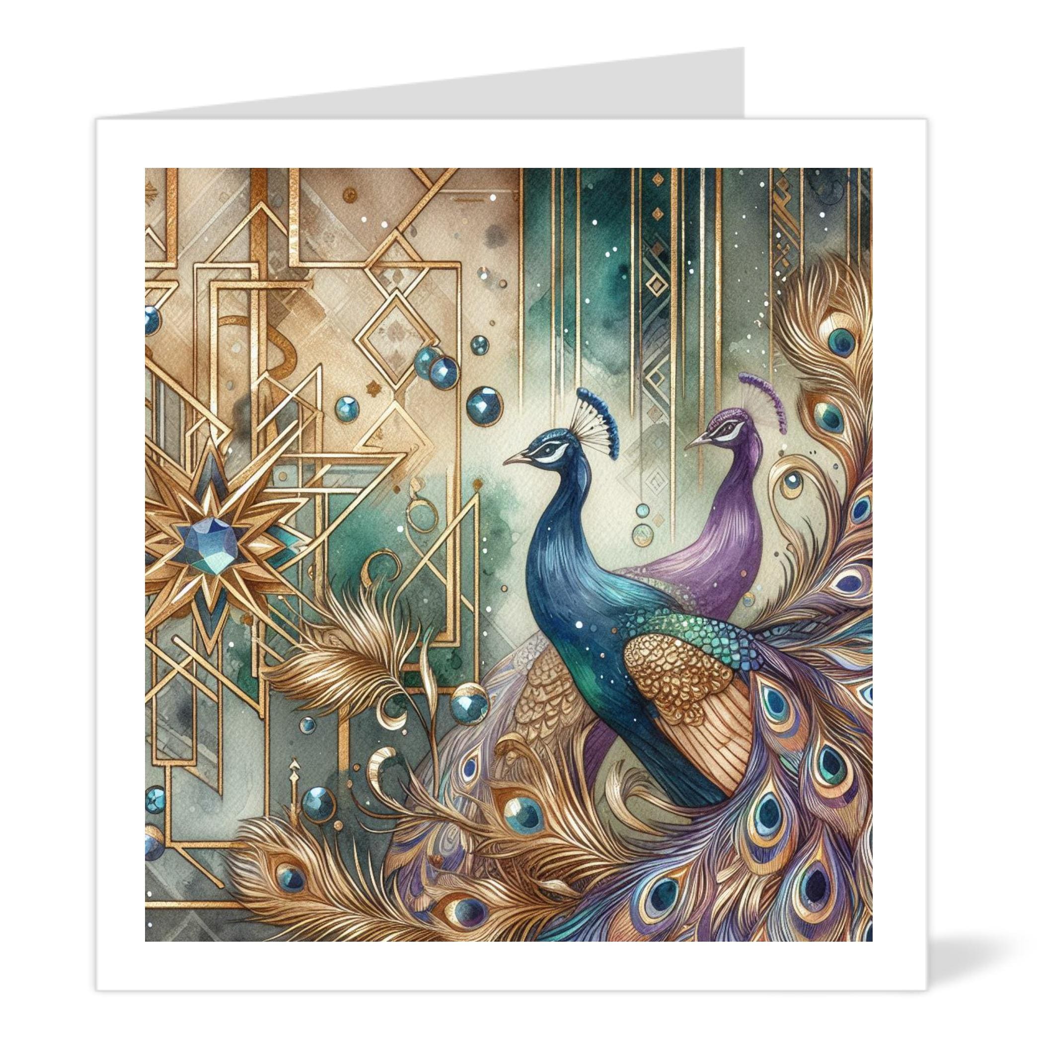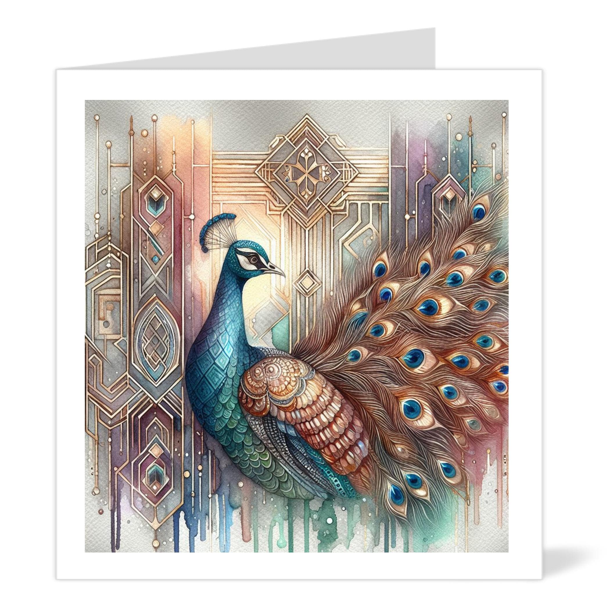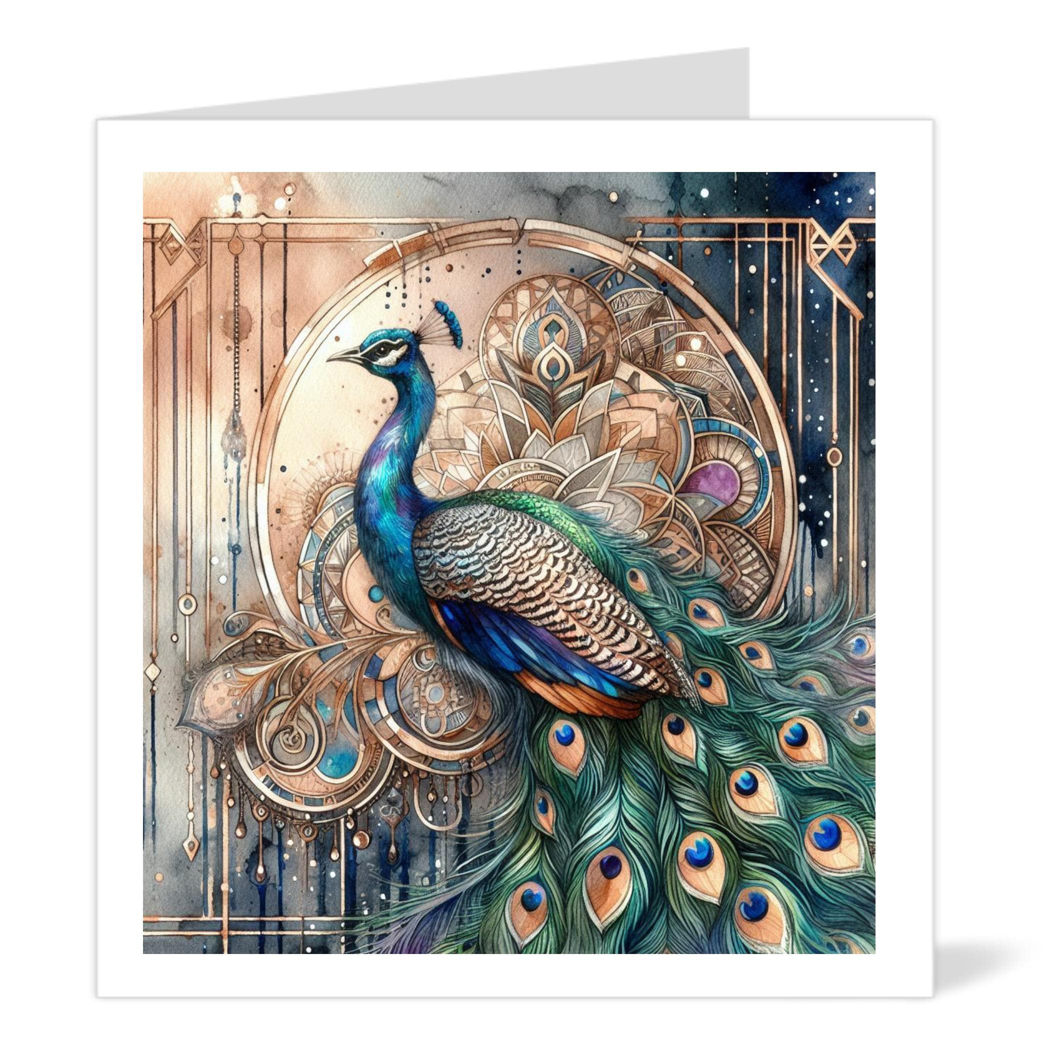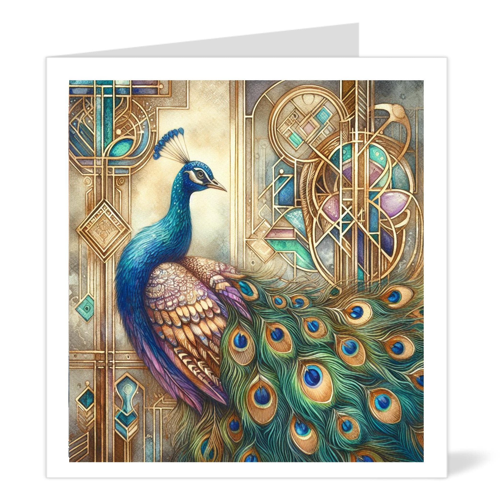 Set of 6 Luxury Art Deco Peacock Greeting or Note Cards, Blank 6" x 6" with Envelopes, Postage Free, supplied with cards & envelopes tied with ribbon in a white gift box. Printed on 220gsm matte photo quality card and mounted on 300gsm cards.